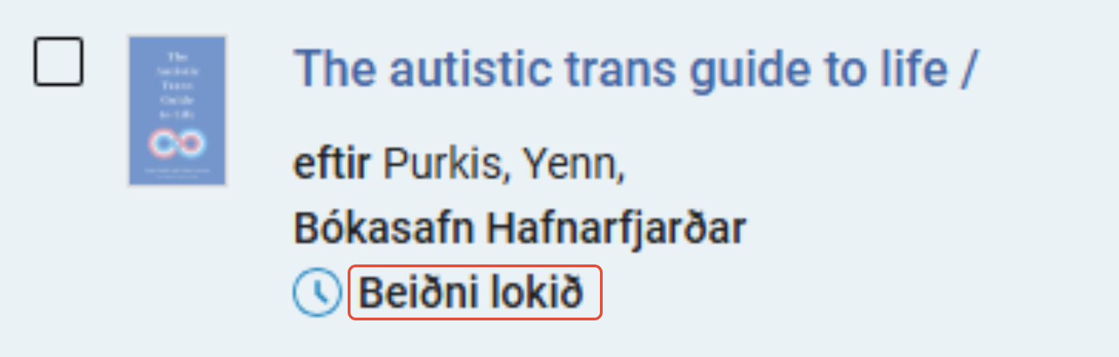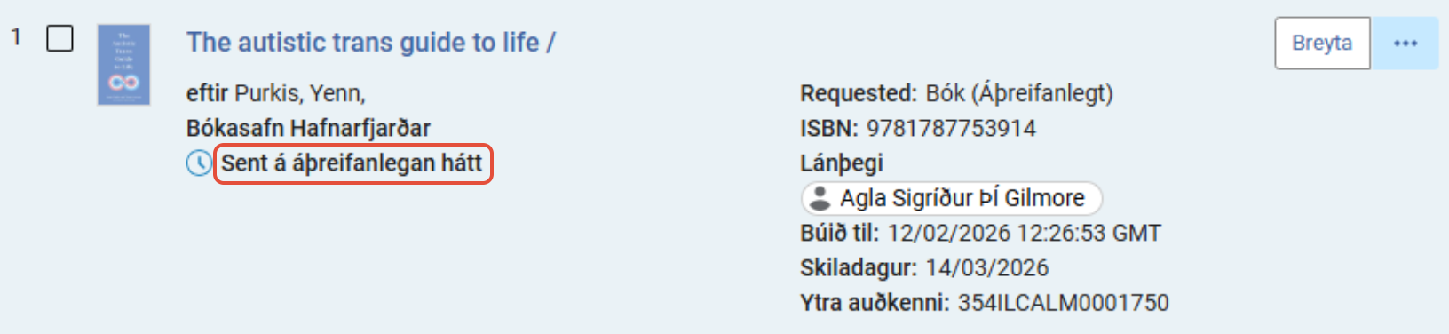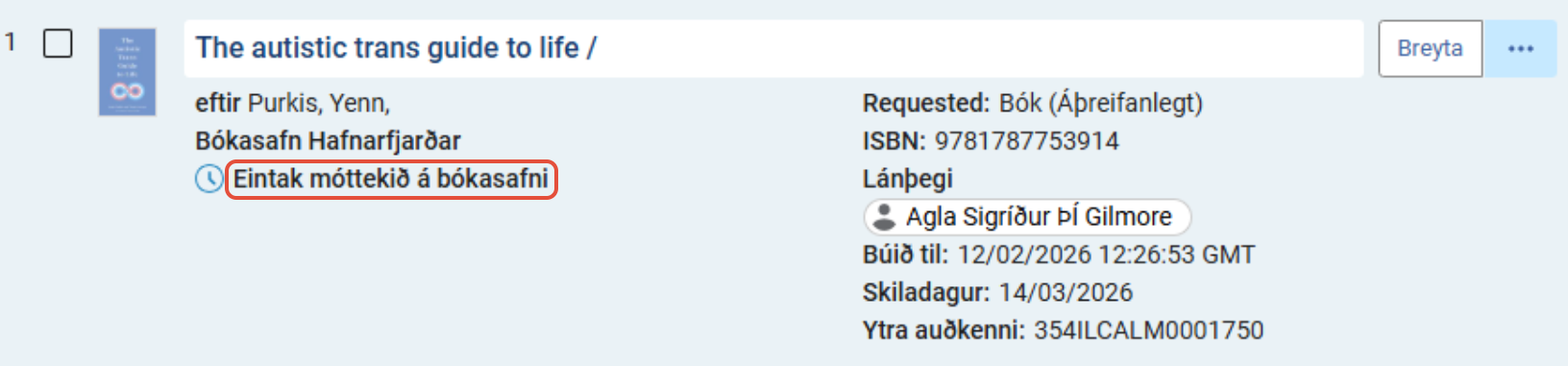 Nú er beiðnin með stöðuna „Eintak móttekið á bókasafni“.