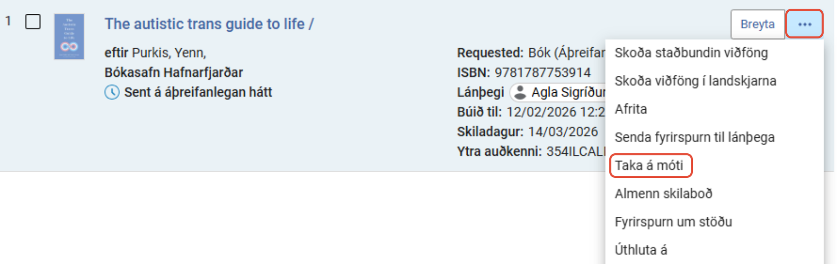 Næst þarf að móttaka eintakið, það er gert með því að fara í þrípunktana og velja „Taka á móti“.