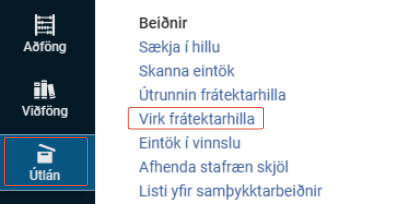Nú sést beiðnin einnig undir „Virk frátektarhilla“ undir Útlán þar sem bókin bíður eftir því að vera sótt af lánþega.