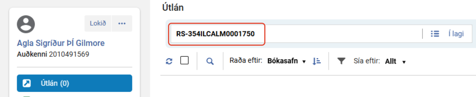 Þegar lánþegi skilar eintakinu aftur á safnið þarf að fara í skilagluggann og passa að skanna inn tímabundna strikamerkið (RS-354ILC…)