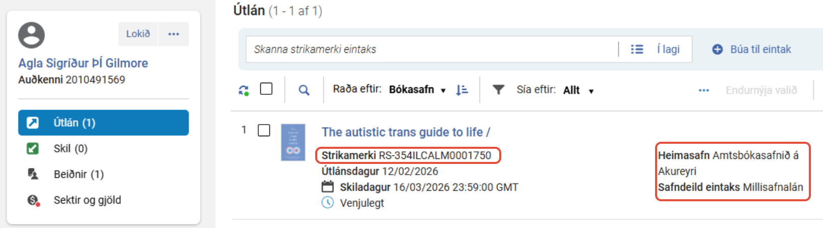 Þegar útlánið er skoðað sést safn lánþegans sem heimasafn, því að það er safnið sem á tímabundna eintakið. Tímabundna strikamerkið sést líka.