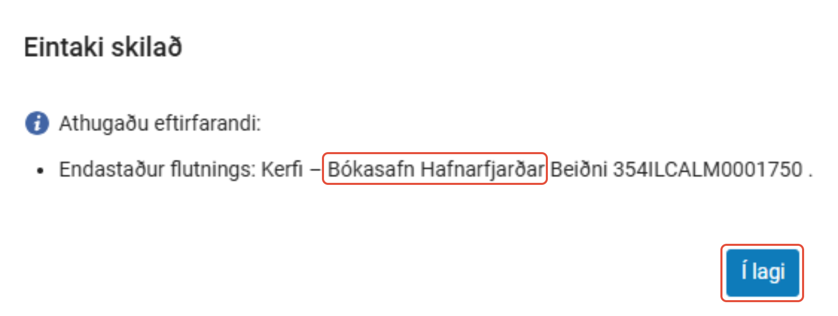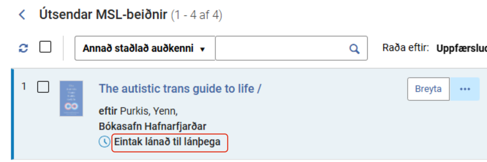Þegar eintakið hefur verið lánað út fær beiðnin stöðuna „Eintak lánað til lánþega“ þegar skoðað er undir „Útsendar MSL-beiðnir“.