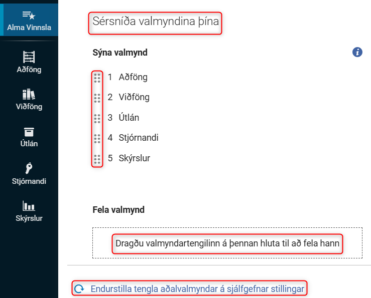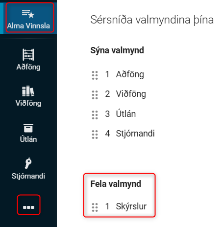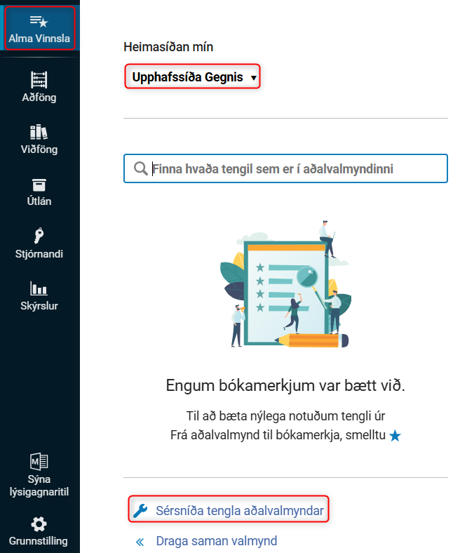 Mögulegt er að stilla vinstri valmyndina eftir eigin þörfum. Það er gert með því að smella á „Alma Vinnsla“ og „Sérsníða tengla aðalvalmyndar“.