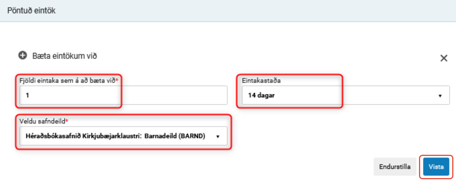 Ef bæta þarf við eintökum sem eiga að fara í aðrar safndeildir eða vera með aðrar eintakastöður (útlánatíma) skal smella aftur á „Bæta eintökum við“.