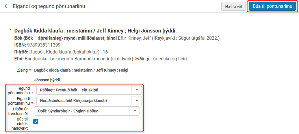 - „Tegund pöntunarlínu“: velja „Ráðlagt: Prentuð bók - eitt skipti“