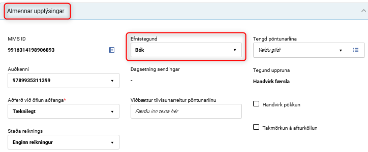 Ef um annað en bók er að ræða, til dæmis spil, þarf að velja viðeigandi form undir „Efnistegund“. Eintökin sem verða til munu erfa þessa stillingu síðar í ferlinu.