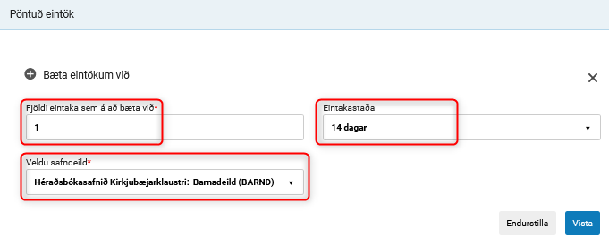 - Velja eintakastöðu (nota útlánatíma sem bókasafnið hefur notað áður)