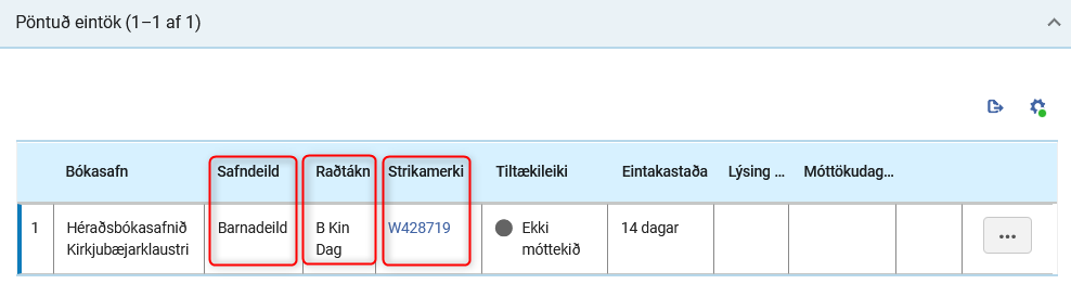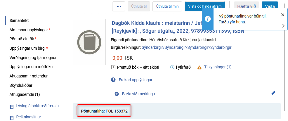 Þegar smellt er á „Vista“ hnappinn birtist strikamerki fyrir eintakið, valin safndeild og þau raðtákn sem eiga við. Kerfið býr til einkvæmt strikamerki fyrir hvert eintak sem er pantað í þessu ferli. Þau eintök sem eru í sömu safndeild eru saman í forðafærslu.