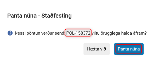 Nú opnast gluggi með staðfestingarskilaboðum og þar er smellt á „Panta núna“: