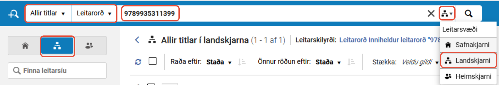 - Leitað er undir „Allir titlar“ og best er að leita í Landskjarna.