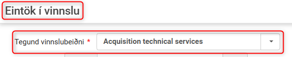 „Tegund vinnslubeiðni“ verður alltaf að vera stillt á: „Acquisition technical services“.