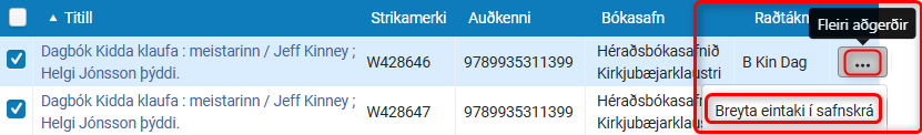 Kerfið býr raðtákn oftast til sjálfkrafa út frá Dewey númeri sem er sótt í bókfræðiskráninguna. Ef það þarf að breyta raðtákninu á þínu safni er smellt á þrípunktana og valið: „Breyta eintaki í safnskrá“.
