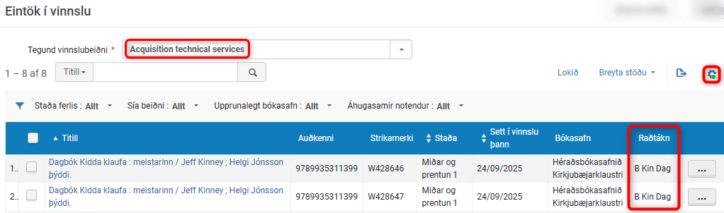 Hér verður að skoða hvort „Raðtákn“ birtist á yfirlitinu og hvort rétt „Tegund vinnslubeiðni“ sé valin.