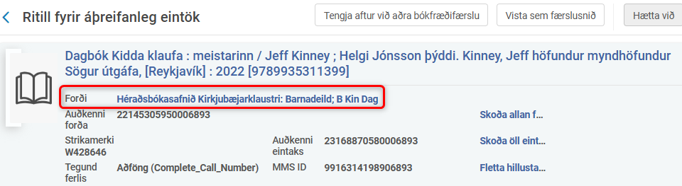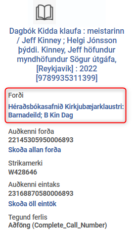 | Forði og forðafærslur Fyrir neðan titil bókar, höfund, útgefanda, útgáfuár og ISBN númer (eftir því sem á við) birtast upplýsingar um forða. Forðafærsla er eins konar millistig á milli bókfræðifærslu og eintaks. Þar eru upplýsingar um: „Forði“ Bókasafn: Safndeild; Raðtákn (kjalmiðamerking) Hver forðafærsla tengist því í rauninni staðsetningu eintaks. Í dæmi um forða hér til hliðar og fyrir ofan er hægt að: Smella á bláa hlekkinn til að opna Færsluyfirlit. Nánari upplýsingar um safndeildir er hægt að finna hér: Safndeildir | ![]() |