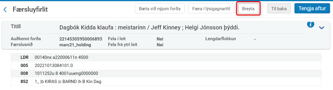 Þegar kerfið hefur lokið við að vista þá hverfur færslan úr lýsigagnaritlinum og þá er hægt að fara aftur yfir í „Eintök í vinnslu“. Ef það þarf að breyta um strikamerki skal fylgja næsta skrefi.