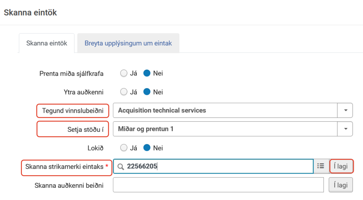 Fara svo inn í „Skanna eintök” (Aðföng > Skanna eintök)
