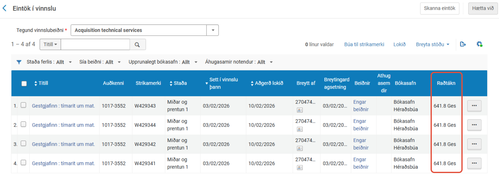 Framhaldið héðan af er eins og með bækur. Farið er í „Eintök í vinnslu“ undir Aðföng.