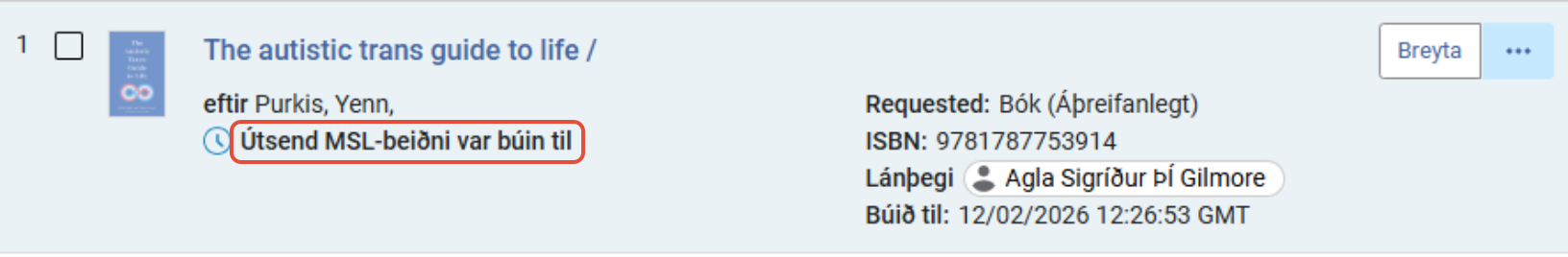 Einnig er hægt að sjá beiðnina með því að fara í „Útlán“ í vinstri valmyndinni og velja þar „Útsendar MSL-beiðnir“.