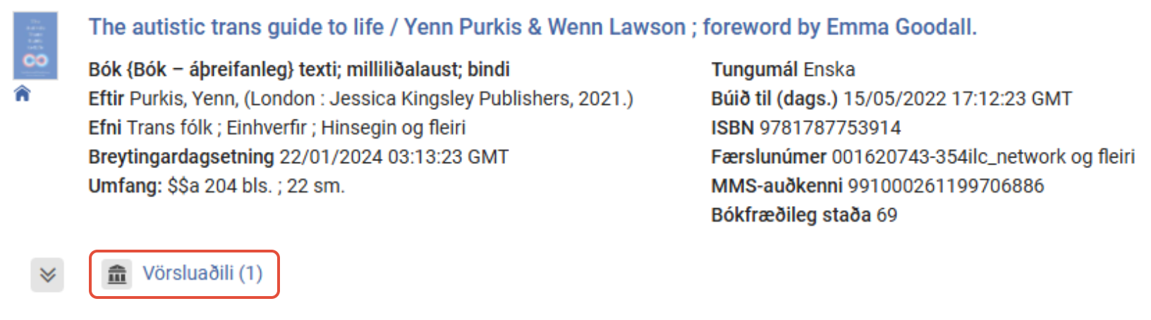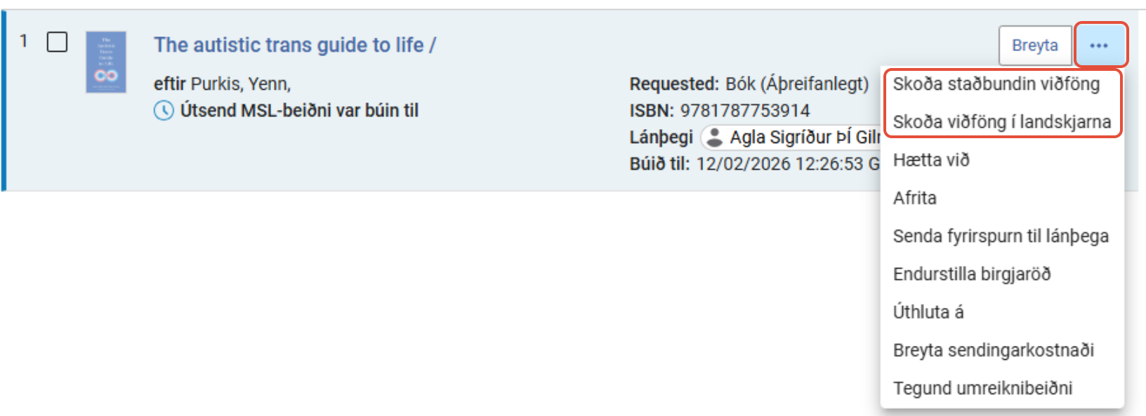 Ef ekki er neitt tiltækt eintak í safnakjarnanum þínum er hægt að fara til baka í „Skoða viðföng í landskjarna“ til að sjá hvaða söfn í öðrum safnakjörnum eiga eintak.