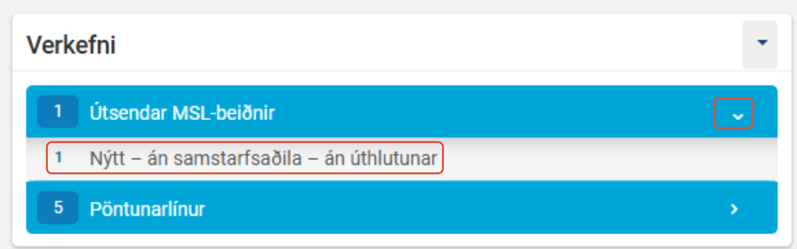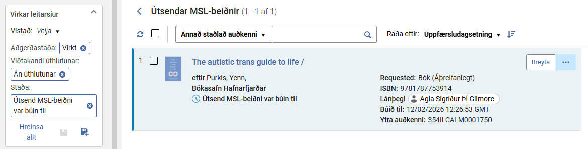 Þá fær beiðnin stöðuna „Beiðni send til samstarfsaðila“. Hægt er að taka út leitarsíuna „Útsend MSL-beiðni var búin til“, og þá sést beiðnin aftur á skjánum.
