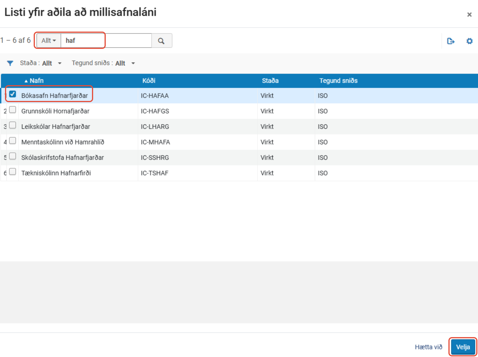 Þegar smellt er á „Bæta við samstarfsaðilum“ er hægt að leita að bókasafninu sem á að fá millisafnalánabeiðnina. Haka við rétta bókasafnið og ýta á „Velja“.