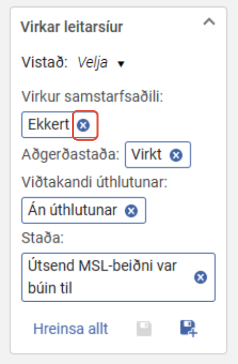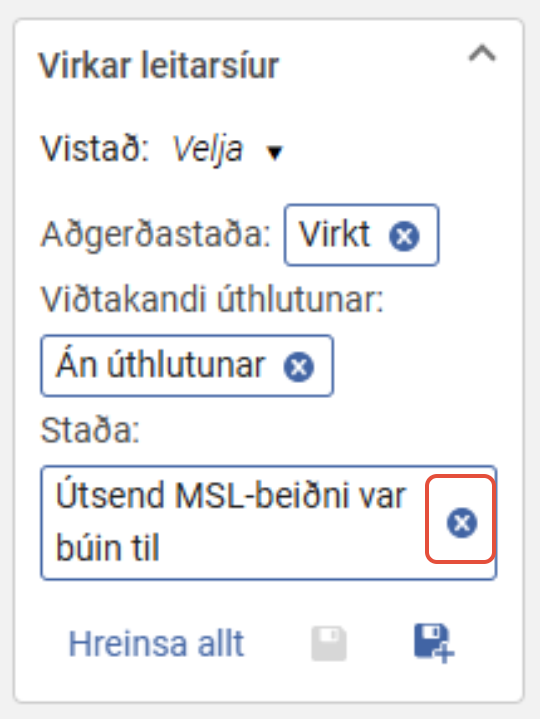 Þegar þessi leitarsía er tekin út þá birtist beiðnin aftur á skjáinn.