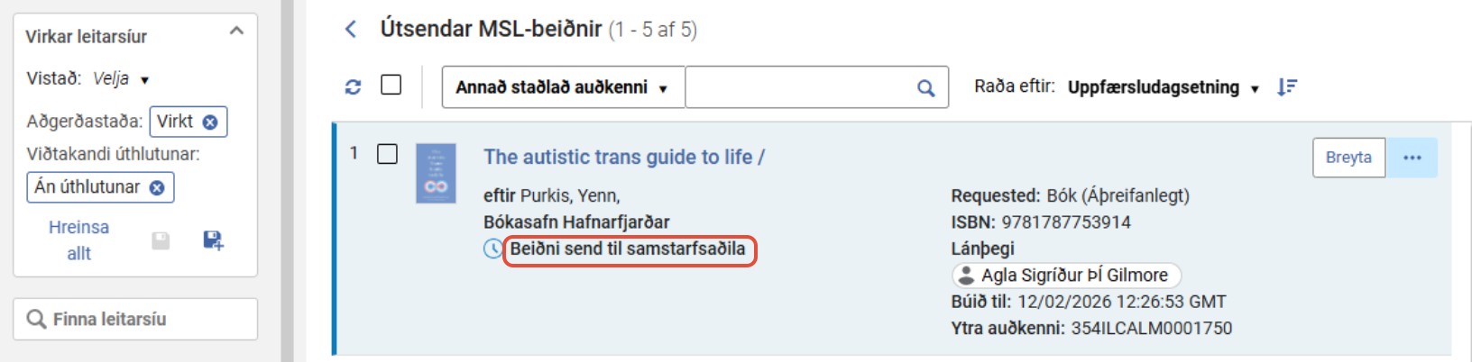 Starfsfólk sér beiðnir fyrir þau söfn sem það er með heimildir í. Beiðnin birtist undir „Útsendar MSL-beiðnir“ og er með stöðuna „Nýtt - án samstarfsaðila - án úthlutunar“.