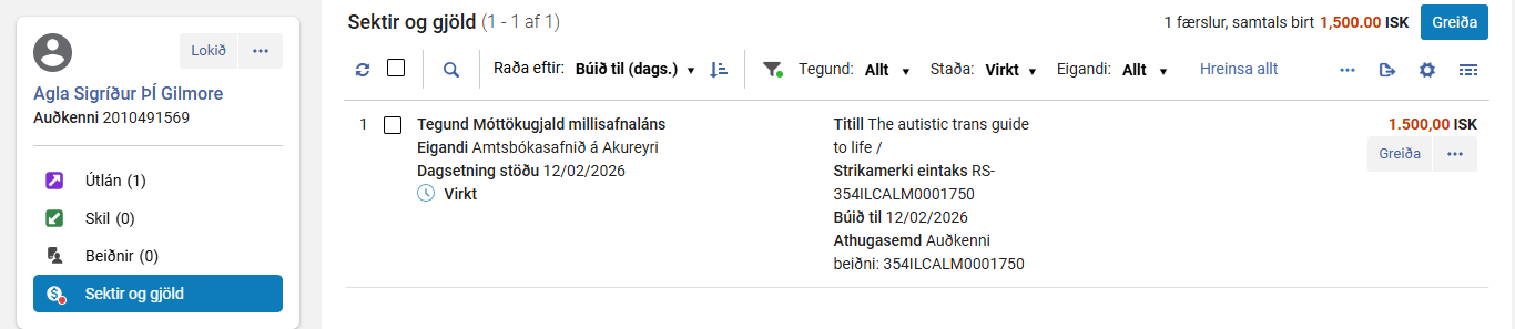 Þegar útlánið er skoðað sést safn lánþegans sem heimasafn, því að það er safnið sem á tímabundna eintakið. Tímabundna strikamerkið sést líka.