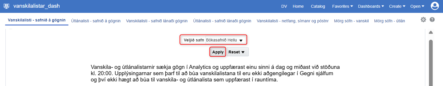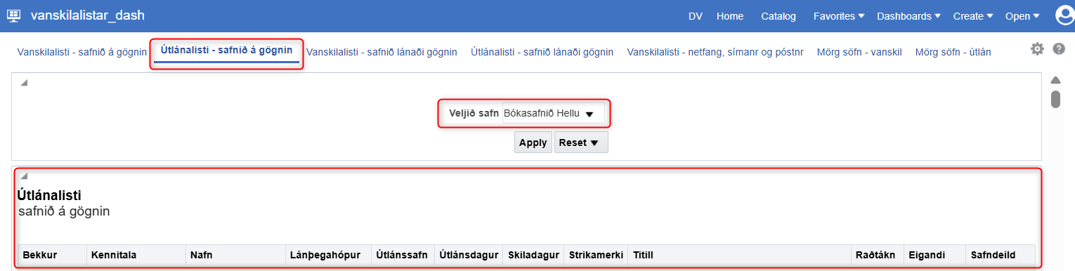 Safnið lánaði gögnin: Sýnir útlán og vanskil á gögnum sem safnið lánaði óháð því hvaða safn á gagnið. Þetta nýtist t.d. skólum sem hafa fengið lánuð bekkjarsett í öðrum skólum og þurfa að geta séð hvort þeirra lánþegar séu búinir að skila þeim.