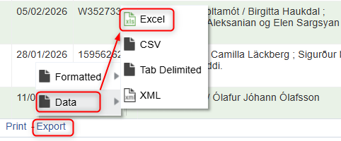 Fara neðst í listann > smella á Export > velja Data og síðan Excel.