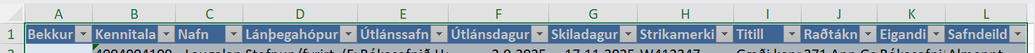Þegar skjalið er opnað birtast ýmsar upplýsingar um lánþega og bækur eða önnur gögn í láni.