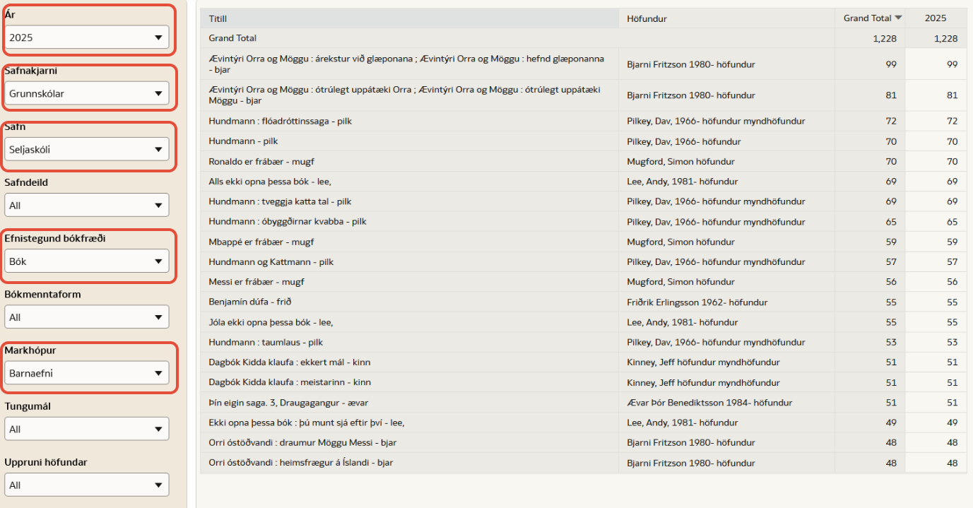 Myndin hér fyrir neðan sýnir útlán fyrir vinsælustu barnabækurnar í Seljaskóla árið 2025. Til að fá þær niðurstöður hef ég valið breytur úr fellilistunum „Ár“, „Safn“, „Efnistegund bókfræði“ og „Markhópur“.