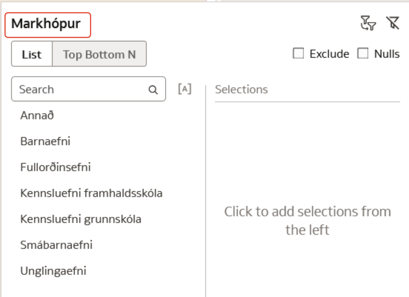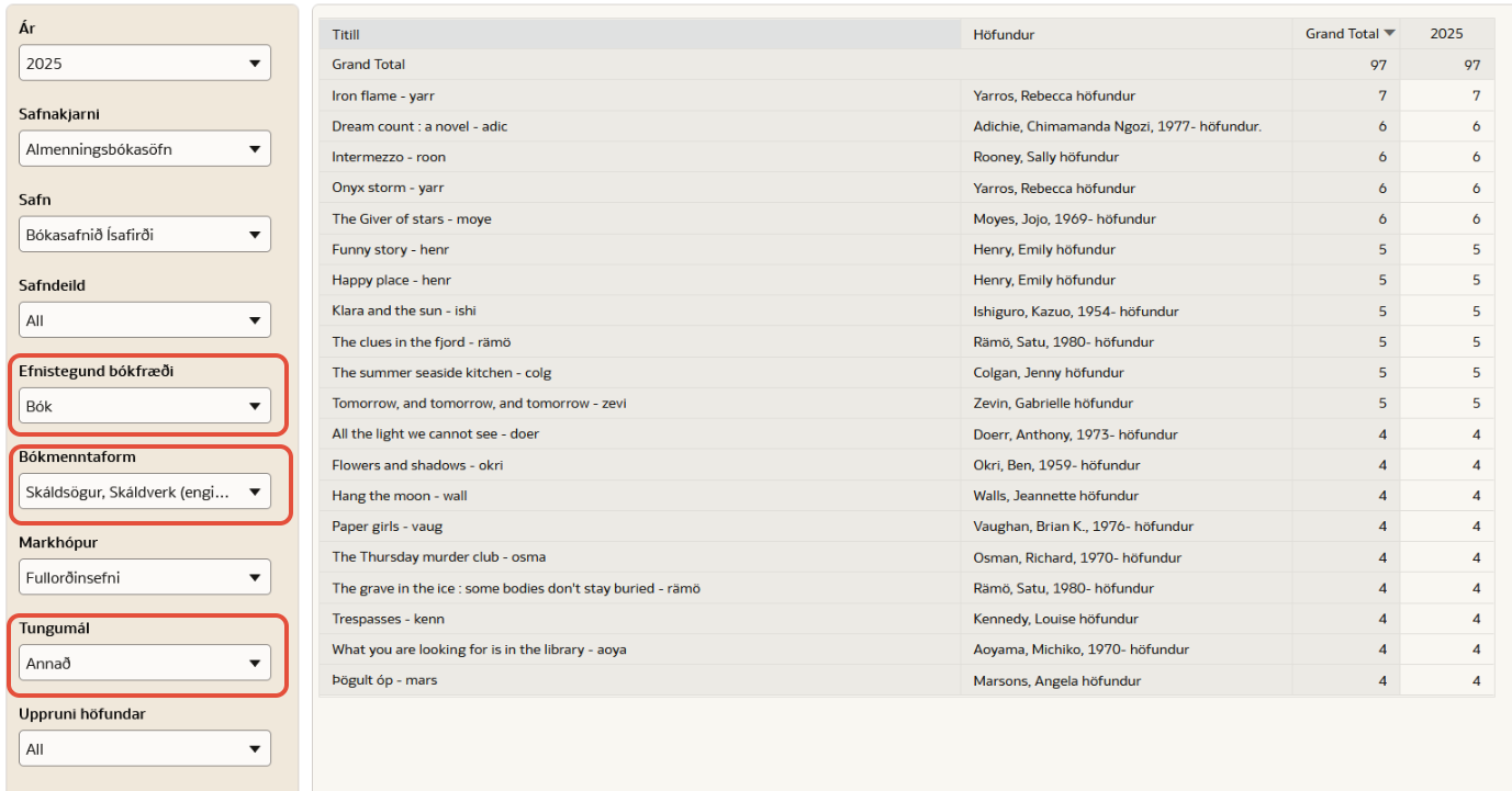 Dæmi: Við viljum skoða lista yfir vinsælustu erlendu skáldsögurnar í Bókasafni Ísafjarðar árið 2025. Þar er engin sérstök safndeild sem aðgreinir erlent efni frá íslensku efni. Því er mikilvægt að við veljum síur undir „Efnistegund bókfræði“, „Bókmenntaform“ og „Tungumál“. Við viljum að tölfræðin sýni ekki barnabækur og vel ég því „Fullorðinsefni“ undir „Markhópur“.