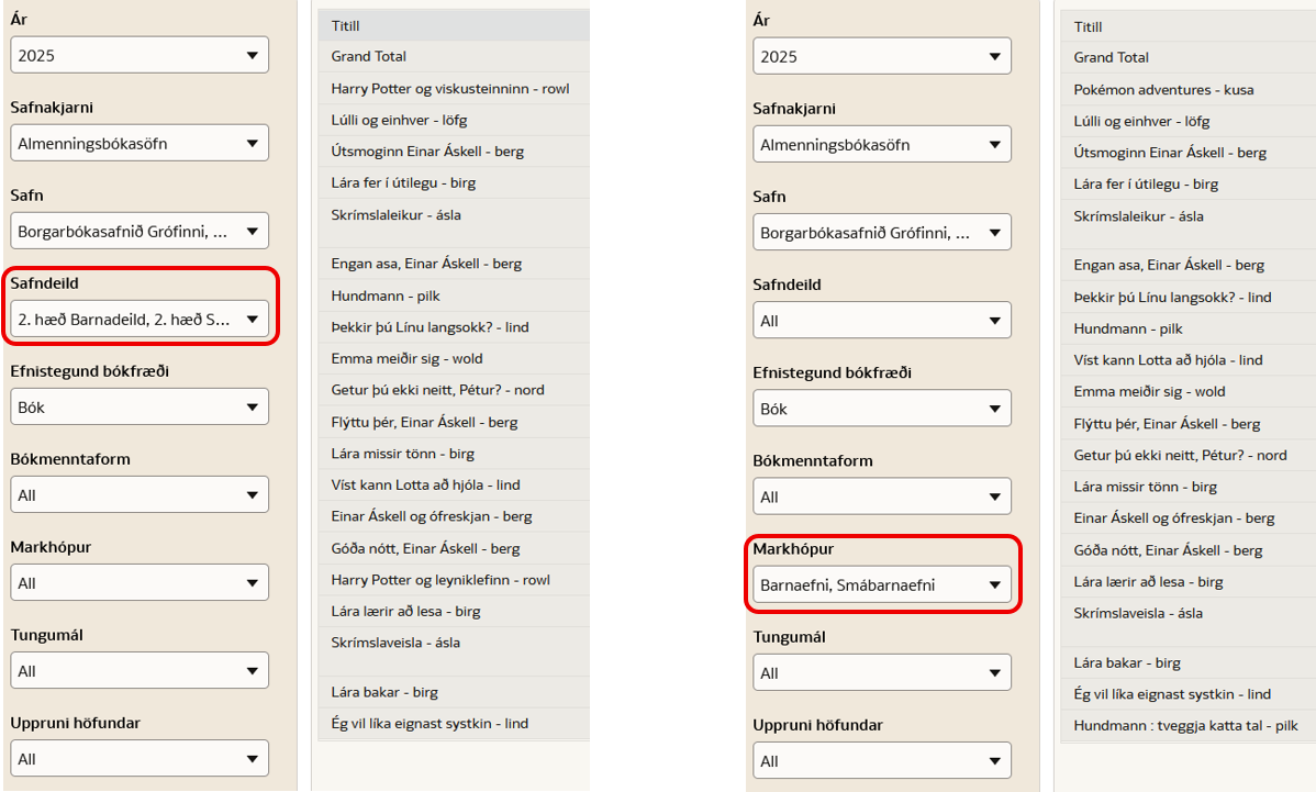 Markhópur jafngildir ekki safndeild. Í dæminu hér fyrir neðan hef ég valið Borgarbókasafnið Grófinni og ætla að skoða útlán á barnabókum árið 2025. Á myndinni hægra megin hef ég valið viðeigandi safndeildir en á myndinni vinstra megin hef ég valið viðeigandi markhópa.